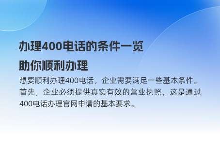 想要顺利办理400电话,企业需要满足一些基本条件。首先,企业必须提供真实有效的营业执照,这是通过400电话办理官网申请的基本要求。具备这个条件后,企业就可以开始享受400电话优势,包括提升企业形象、优化客户服务等重要价值。这些优势的获得建立在企业资质合规的基础上。